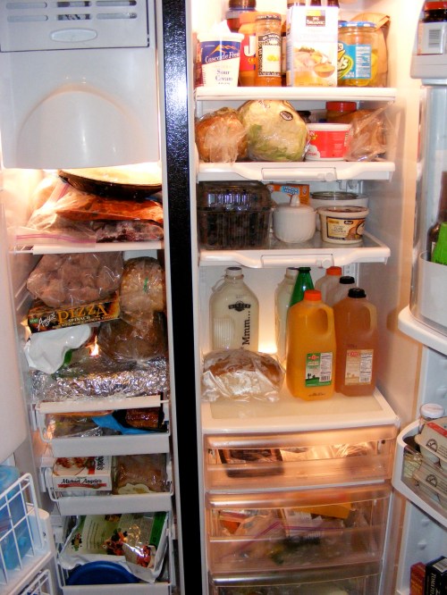 This approximates what our frig/freezer looks like today. The freezer is the worst. The ice maker takes up at least 1/3, dog food 1/4, bread 1/4 and the rest frozen… stuff. Our organic delivery schedule is changing but we keep up the milk in glass bottles, apple and orange juice. Our pantry is pretty well stocked, too, but a lot of it is herbs and spices, flour and sugar and tea. Perhaps we should take a lesson from earlier this year and start seeing how long we can go on current stores.