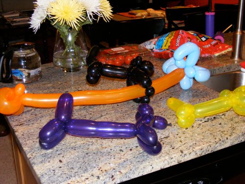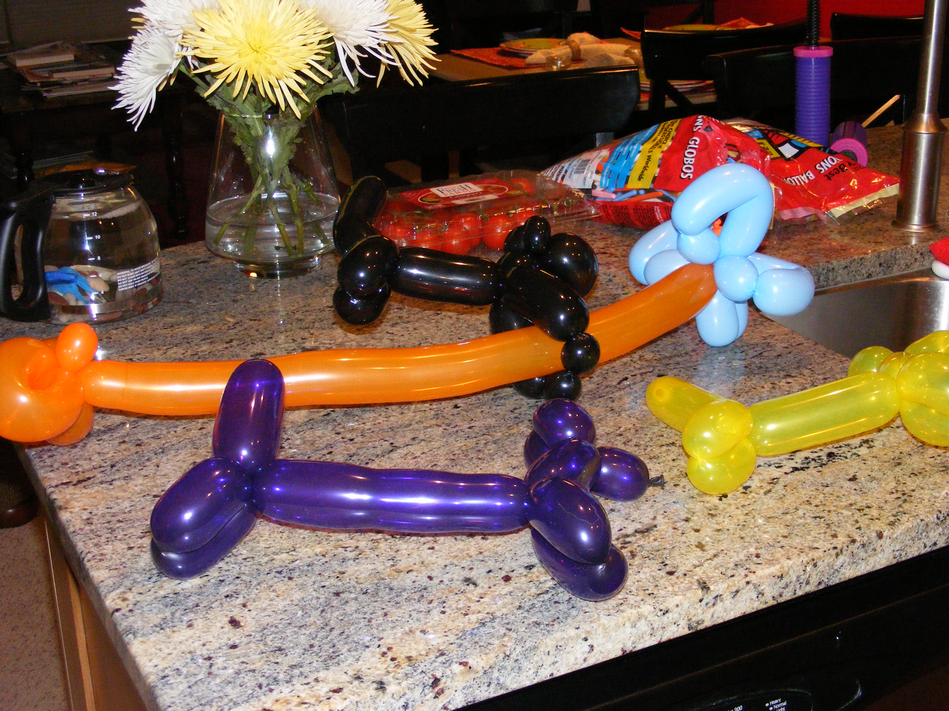 Last night when my husband arrived home, he eagerly opened two packages that came in the mail. Five hundred balloons and two air pumps. The book on balloon twisting will arrive next week but he started out with three dogs and a monkey climbing a palm tree with video instructions playing on his iPhone. No, it’s a 3GS, not a 4 until they fix the issues they’re denying.