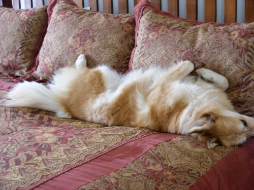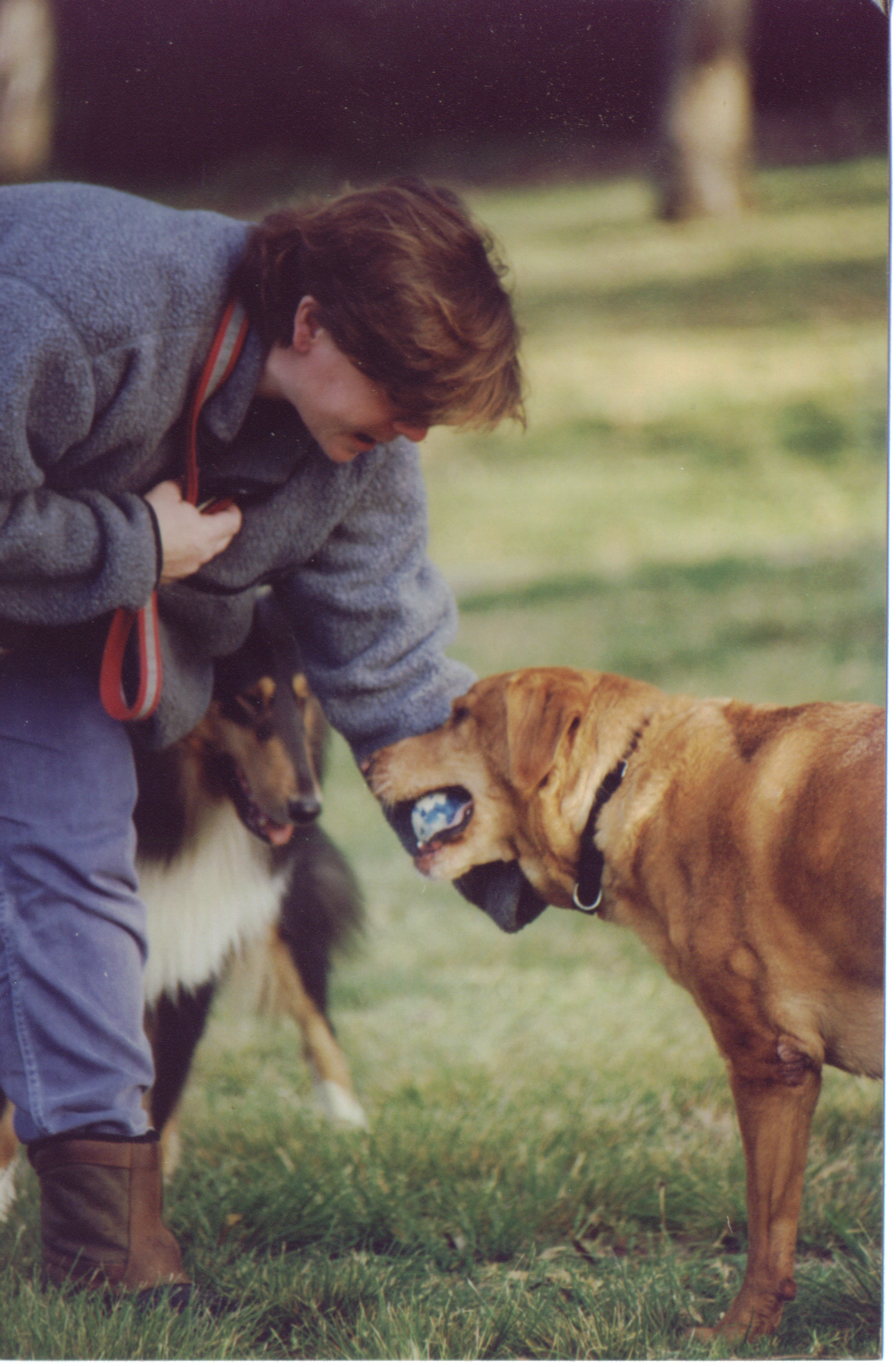 After my family’s Collie died I decided to devote a year to service at an animal shelter in her honor. Thus began a many-year relationship with the Helen Woodward Animal Center and two adoptions. That first year (of 6-7) I spent a lot of time with a scared Golden/X female age one who came in the week I started. She’d been abused by her owner and neighborhood children and was terrified of men (especially in uniform) and kids. While this was a no-kill shelter my Chani started deteriorating after many months there. I had her home the next day, she was two by then, and with love, my training and professional help she was the dog all the kids loved at the playground, the ones she visited with her favorite stuffed animal the day before she died nearly ten years ago.