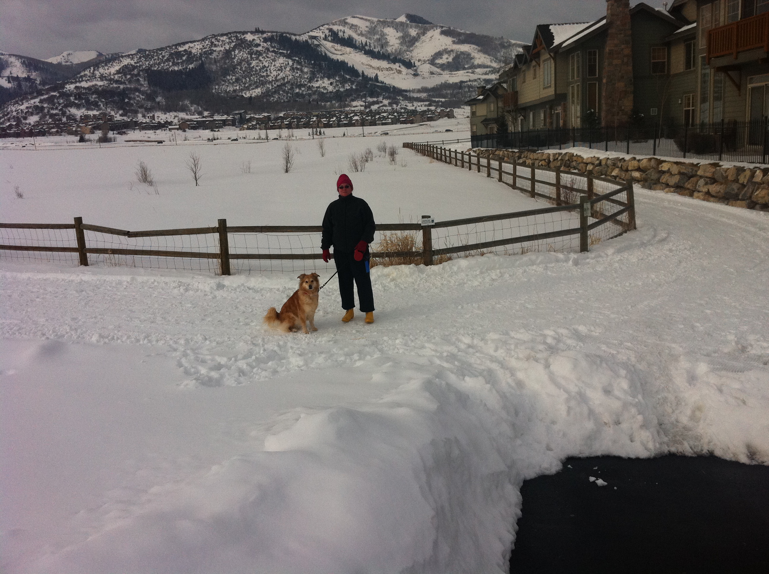 Our friend and dog on our path. It’s compacted as it is groomed about twice a week when it snows. It’s strange to walk along the path at such a height and see the fence to the Preserve about at one’s waist or knees. My new boots feel like snowshoes and keep me steady on an uneven path, as well as warm.