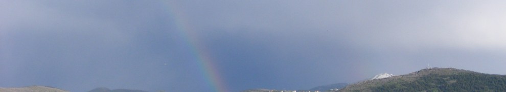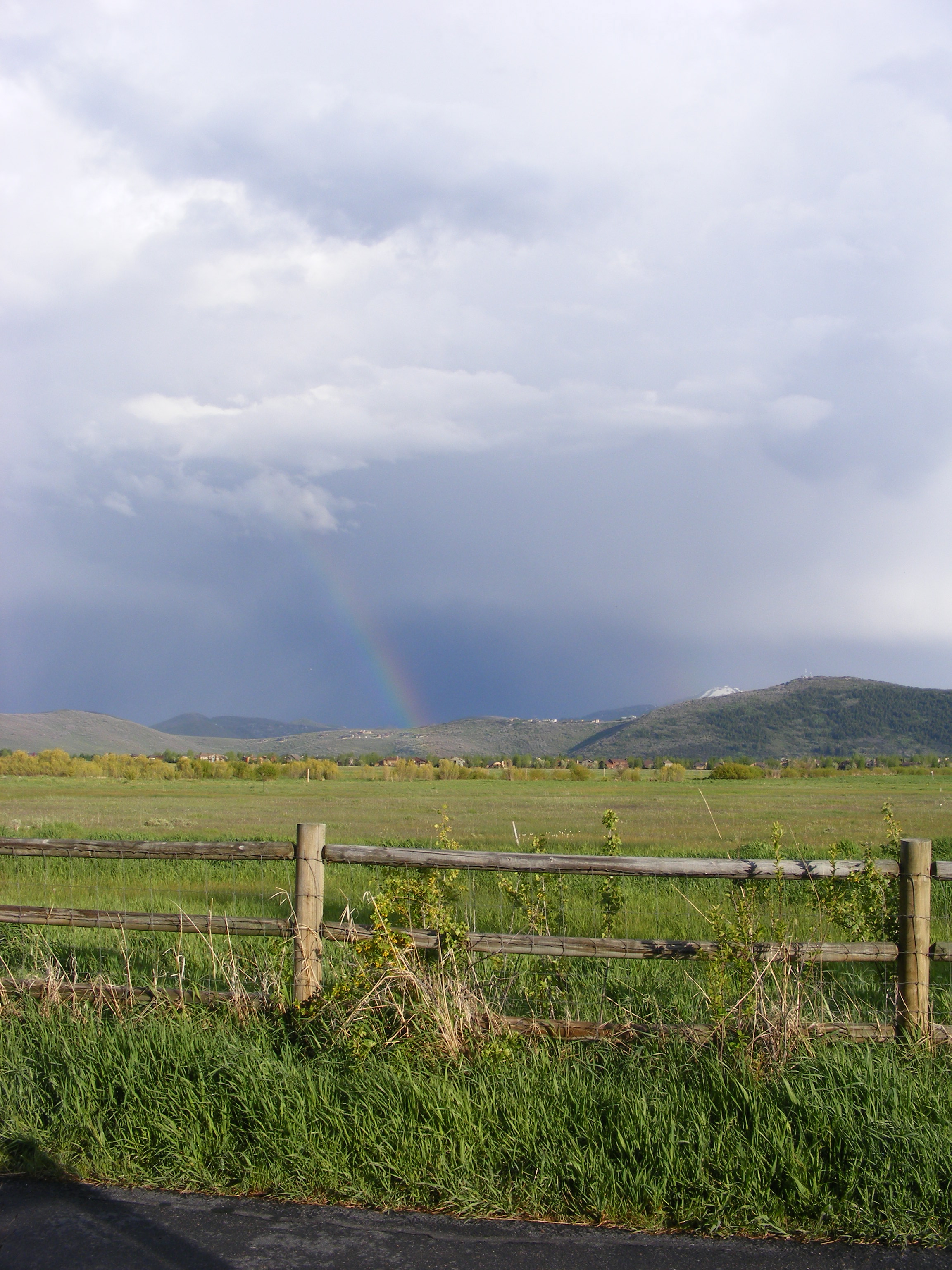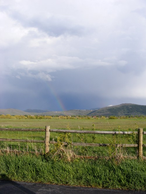 There was a really loud thunderstorm last night and the dog hugged my feet at this “desk” for an hour. It left a lovely rainbow and I caught the last few moments of it. Perhaps I’ll get a photo of the cranes and their two colts, but they’ve been hanging out pretty far out to get a good shot. Cheers, Dee