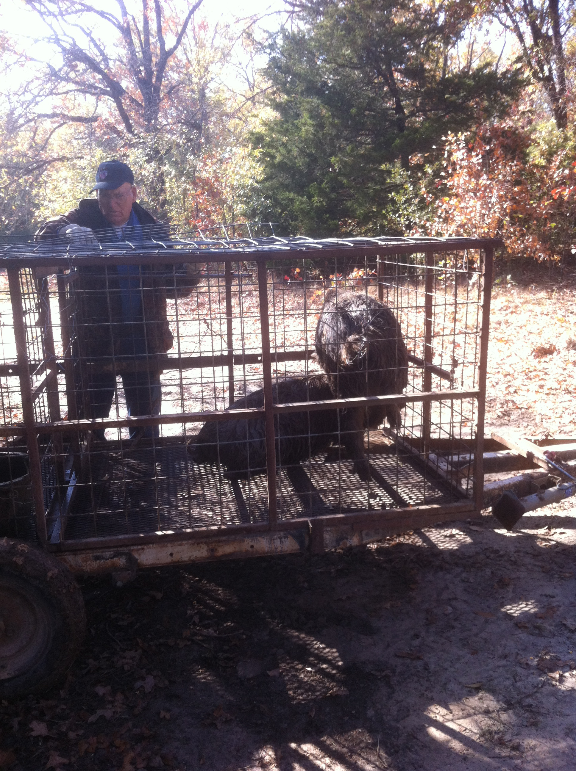 Moving them from the circular trap to a truckbed pen was interesting. As you see, I’m taking photos, never got closer than a few feet away. They have to wire up extra cage parts (without being bitten) to make sure the hogs go through the chute and safely into the pen for transport.