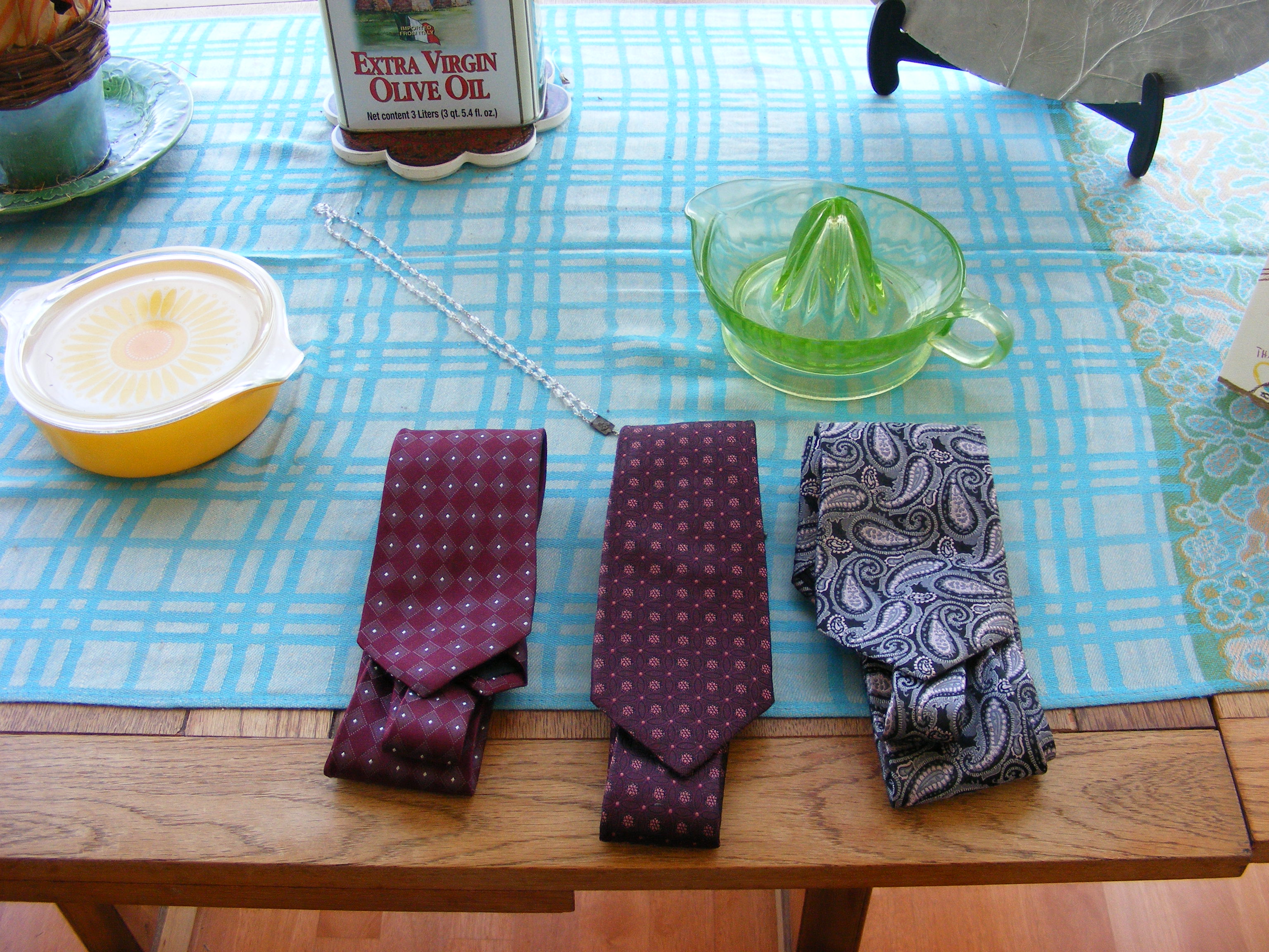 He has three ties that fit him and may be of this decade. The middle one is our “test tie” from The Dark Knot, Glastonbury Circles. But we needed some blues. Sadly, our wedding tie I bought him no longer works. I hope someone at St. Vincent de Paul can use it.